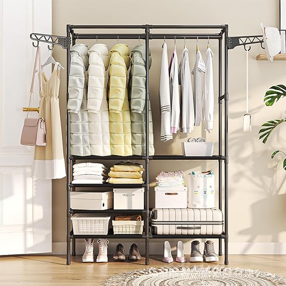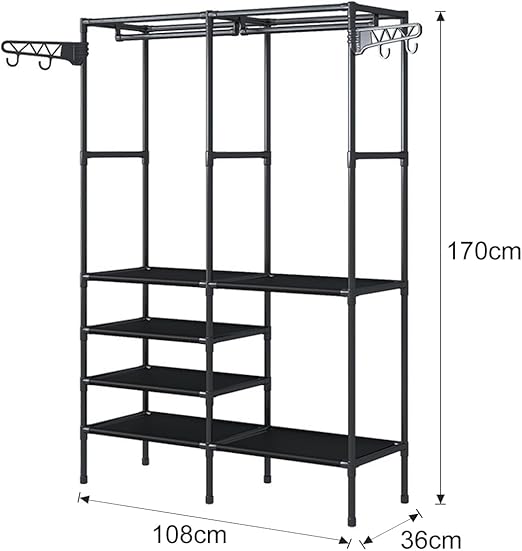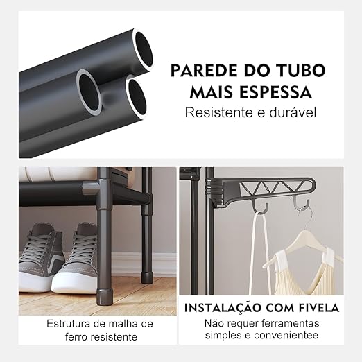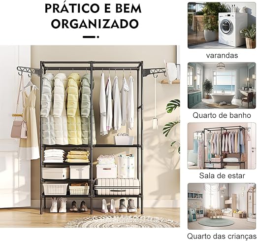 Estrutura 3 em 1: Oferece uma barra superior para cabides, prateleiras multinível para sapatos ou caixas, e ganchos laterais integrados para bolsas e acessórios.