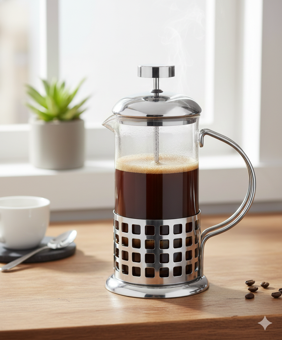 • Puxador Ergonômico: A tampa e o êmbolo possuem acabamento em metal polido, com um pegador confortável para o movimento de prensagem.