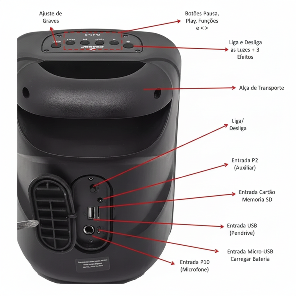 - Alto-falante Woofer com potência de 10w RMS (Reais), são de longo alcance e muito potente.