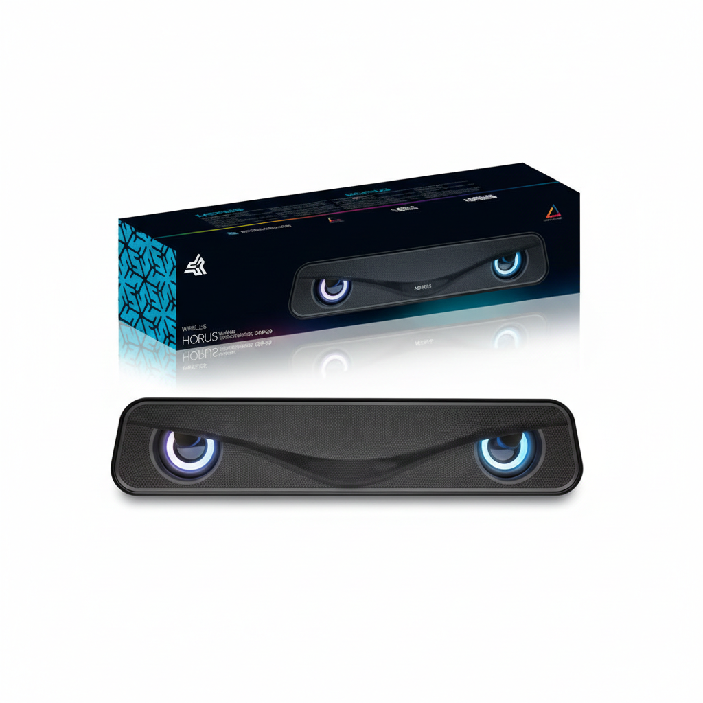 Esta caixa de som Bluetooth tem um design que realmente chama a atenção, parecendo um par de "olhos" futuristas com iluminação LED. É um produto focado no público gamer e em quem busca um visual moderno para o setup.