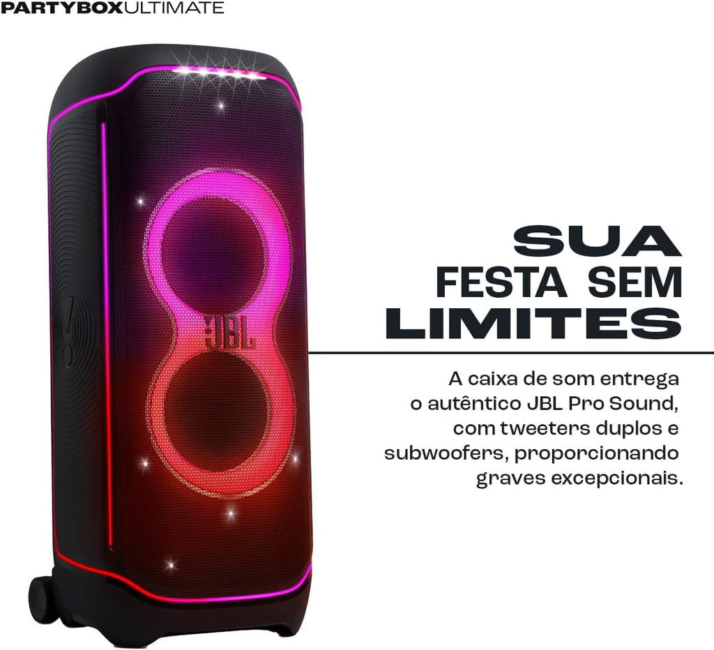 - Aplicativo JBL One: Controle de luzes, efeitos de DJ, equalização e funções da caixa.