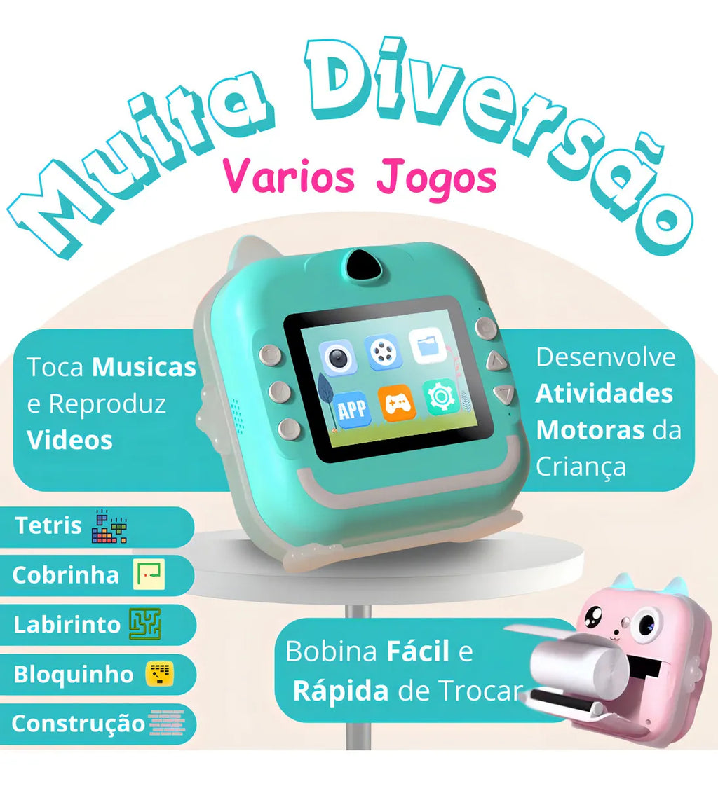 Câmera Digital: Além de imprimir, o dispositivo funciona como uma câmera digital padrão, permitindo que as crianças capturem momentos e os visualizem na tela.