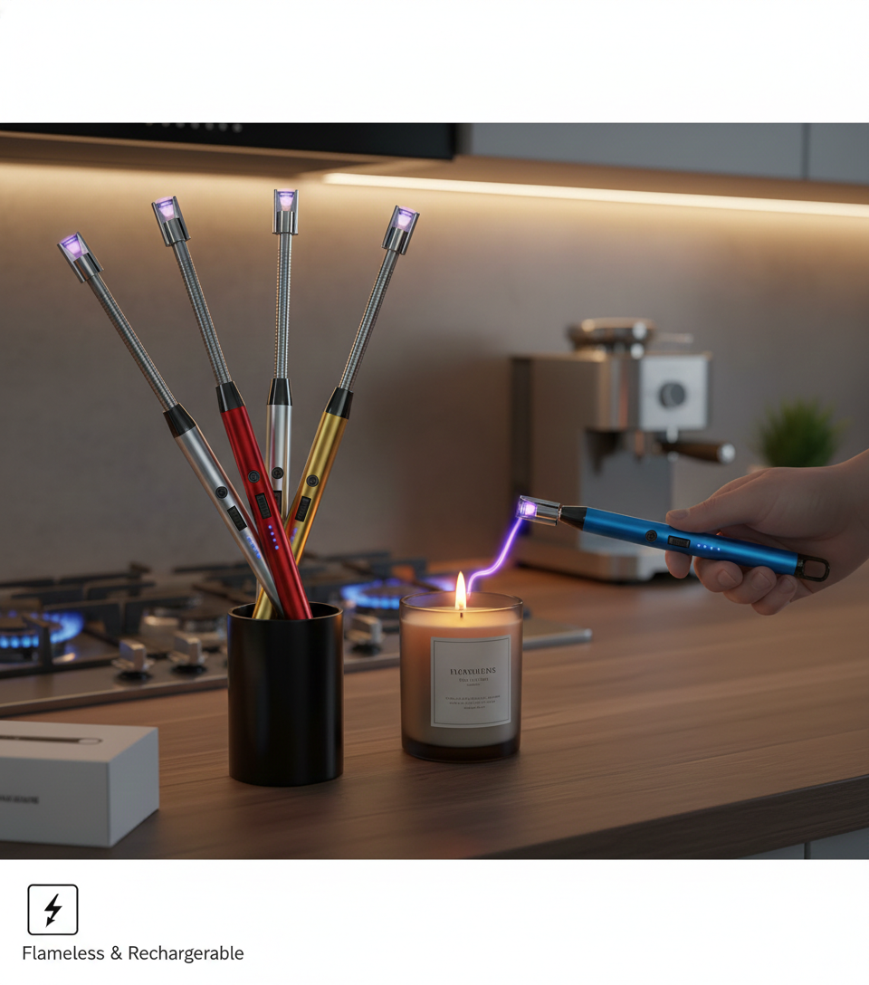 Haste Flexível e Articulada: A ponta metálica flexível permite que você direcione o acendedor em qualquer ângulo, sendo perfeito para alcançar pavios de velas profundas ou bocas de fogão difíceis sem queimar os dedos.